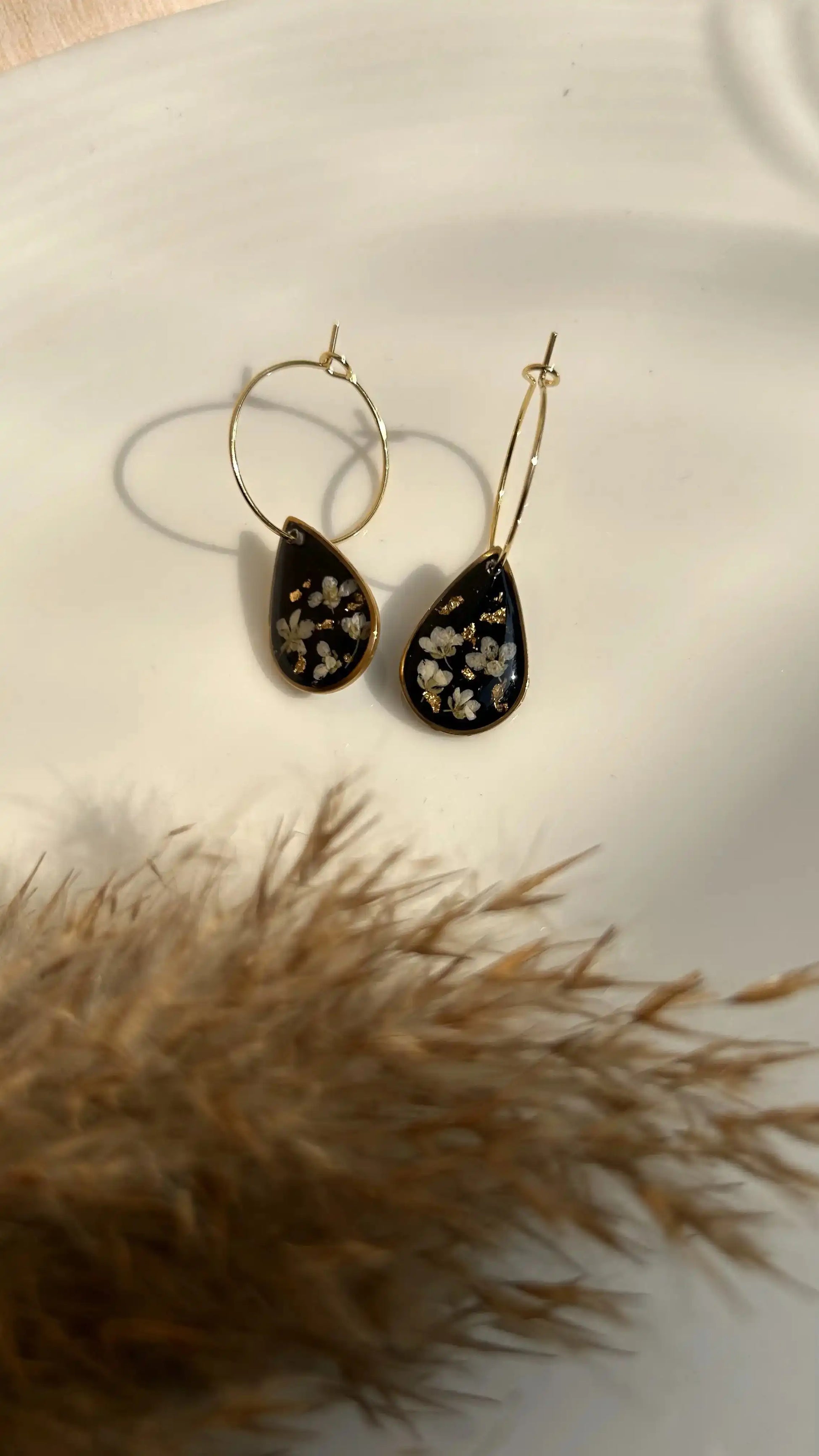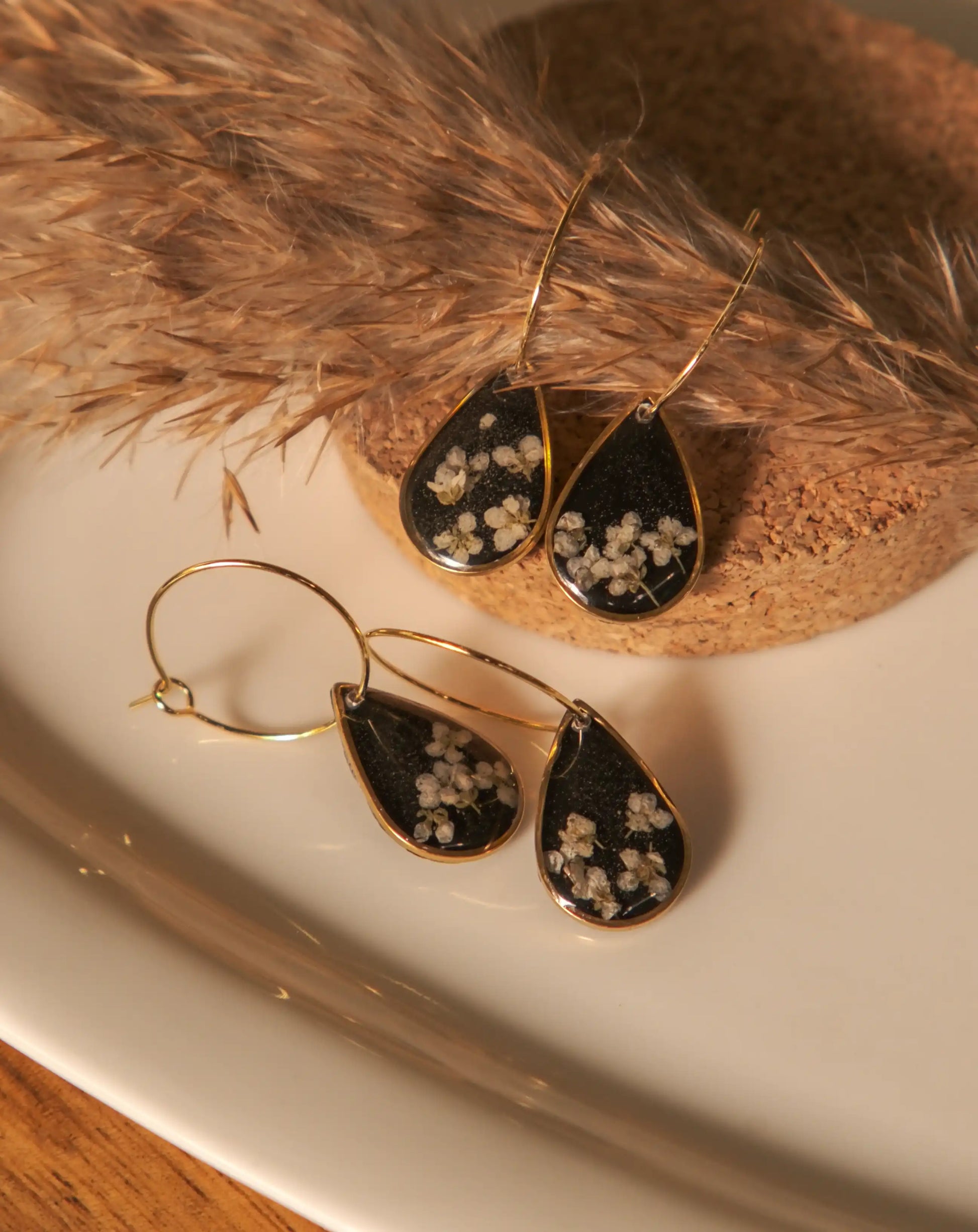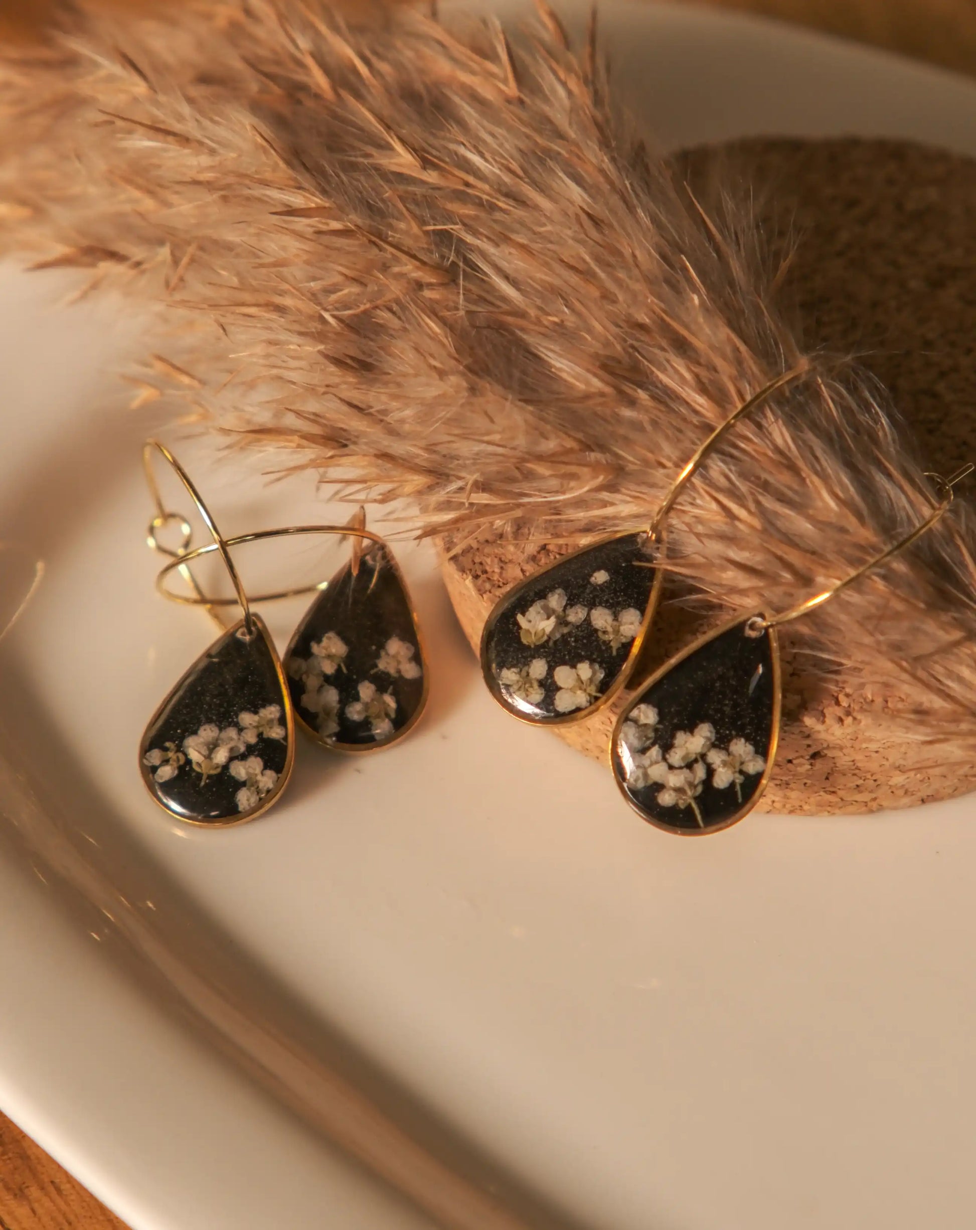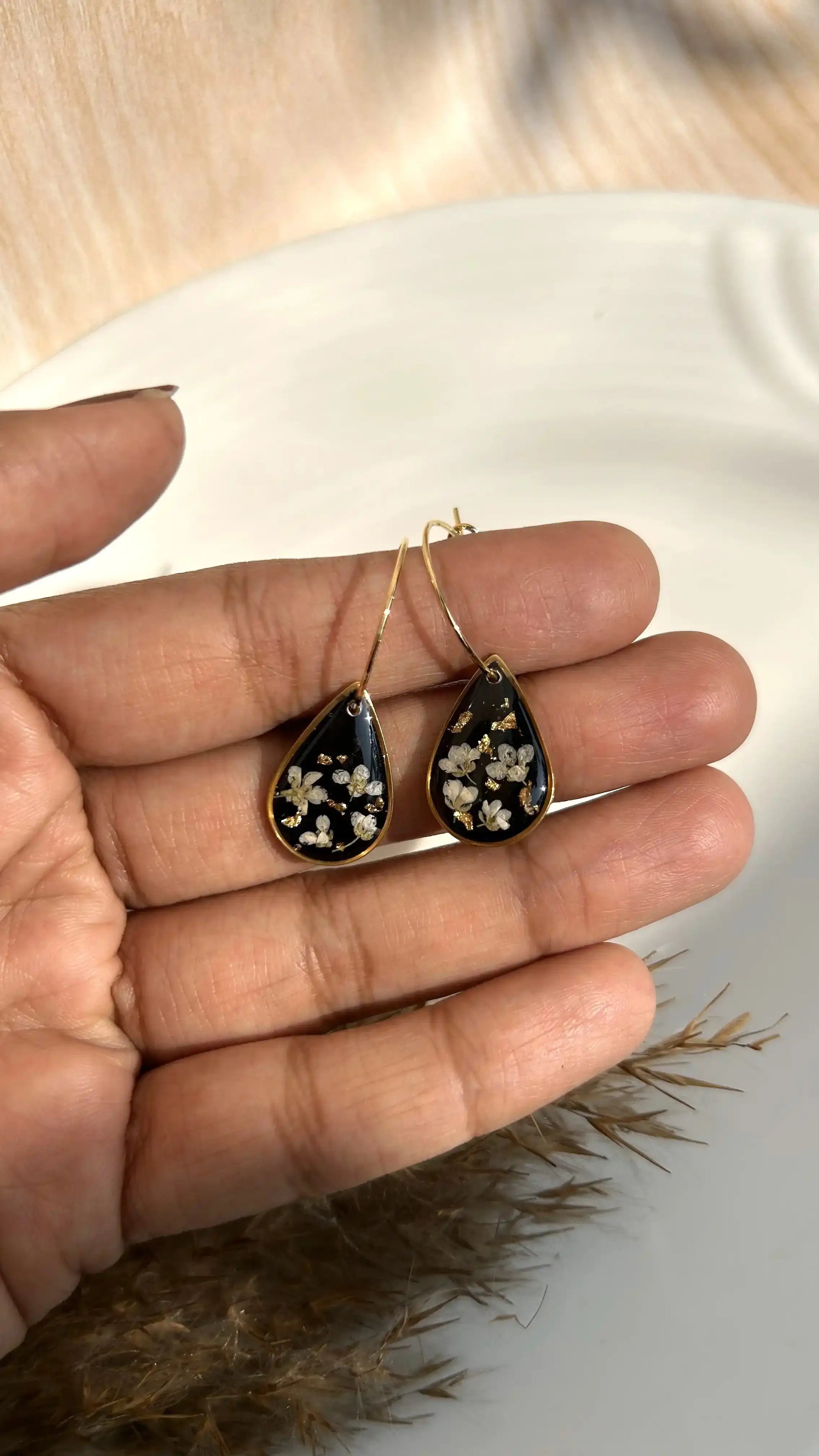 Celebrate the harmony of nature and craftsmanship with these stunning teardrop earrings. Real sweet alison flowers, known for their delicate beauty, are meticulously preserved and set against a deep black base, creating an elegant contrast that enhances their natural charm.