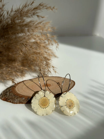 Embrace the beauty of nature with our delightful Daisy Flower Hoop Earrings. These elegant hoops feature real preserved daisy flowers, showcasing their delicate white petals and cheerful yellow centers. Each flower is carefully arranged to highlight its natural charm, creating a light, fresh design that adds a whimsical touch to your look. Lightweight and comfortable, these hoops are perfect for both casual outings and special occasions, adding a subtle floral accent to any outfit.
