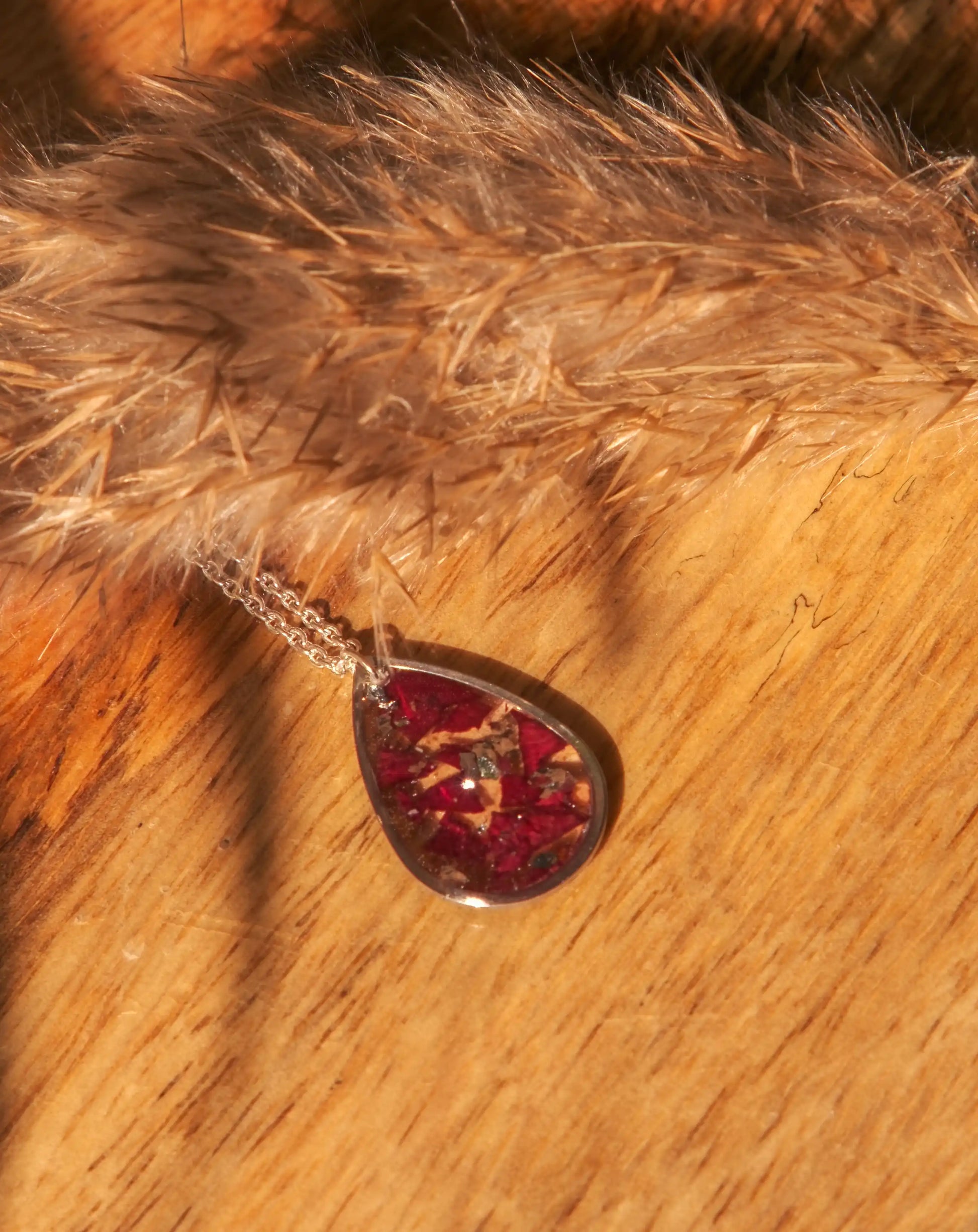 The enchanting teardrop pendant captures the romance and elegance of real crushed rose petals, beautifully preserved within a crystal-clear resin setting. The delicate rose petals, rich in color and texture, are artfully arranged to create a timeless keepsake that evokes a sense of love and grace. Available in both silver and gold-plated finishes, the pendant offers versatile styling options to suit your personal taste. The silver-plated version brings a cool, modern touch, while the gold-plated option adds a hint of classic warmth and luxury.