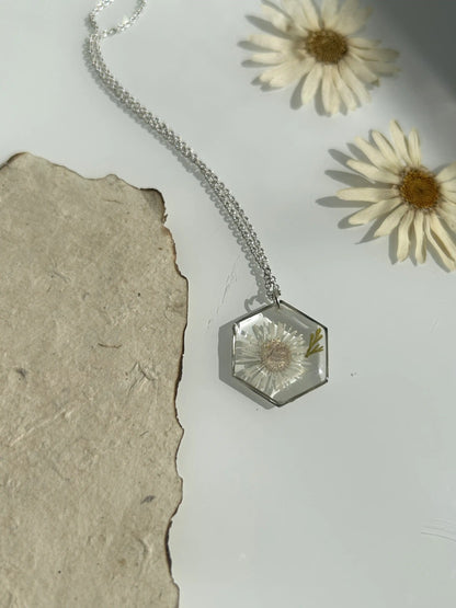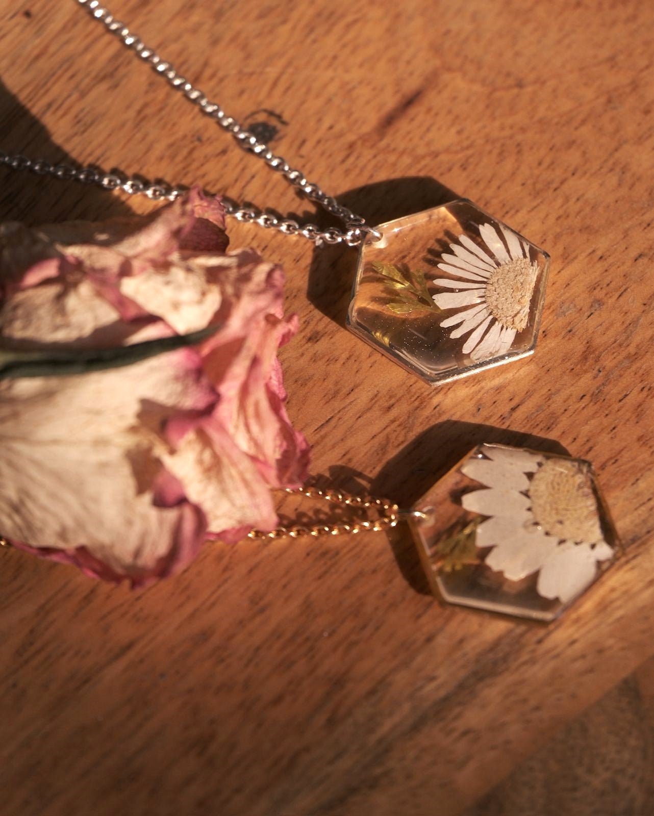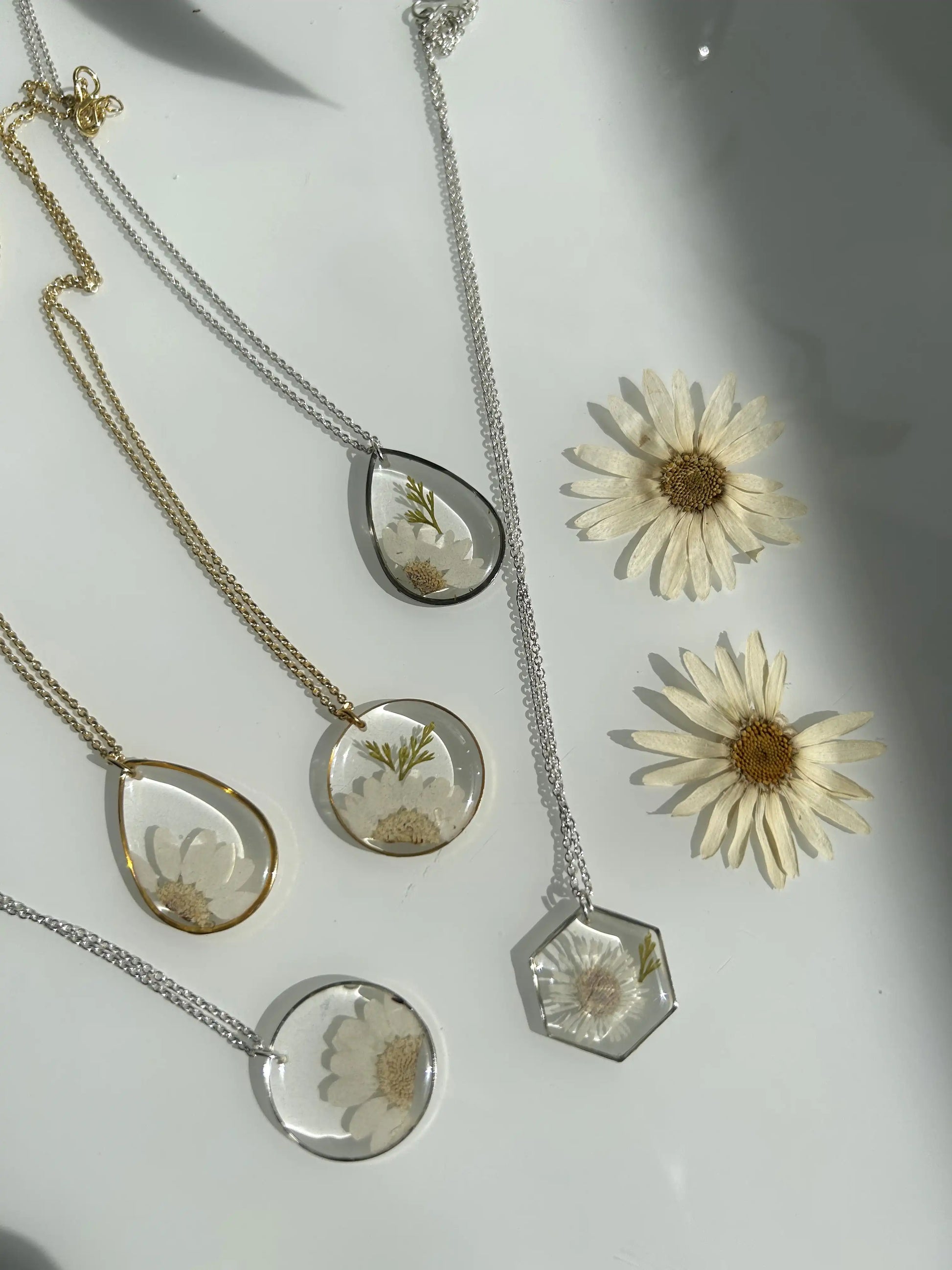 Each pendant showcases the daisy's vibrant white petals and sunny yellow center, capturing the essence of a fresh bloom in every detail.