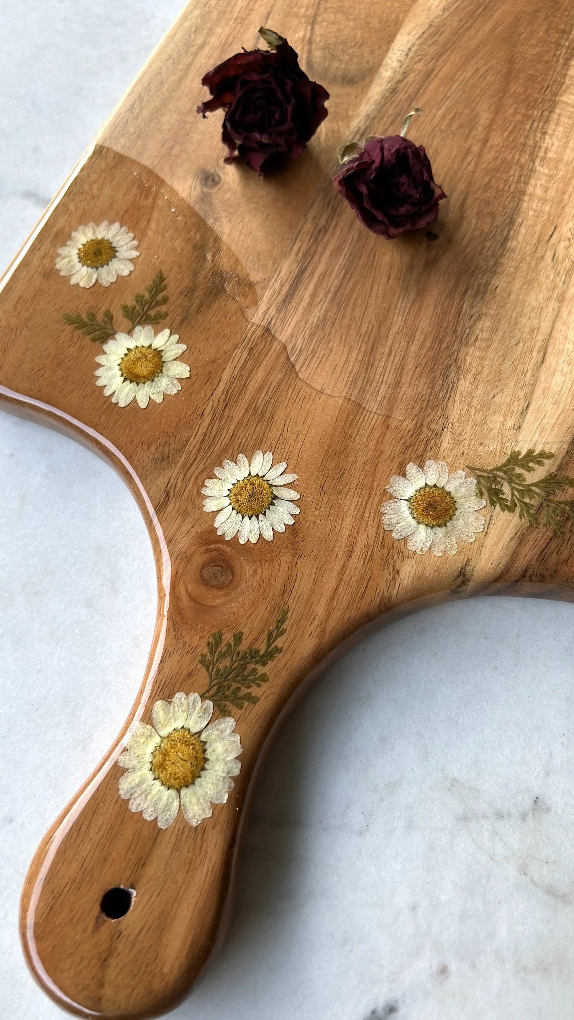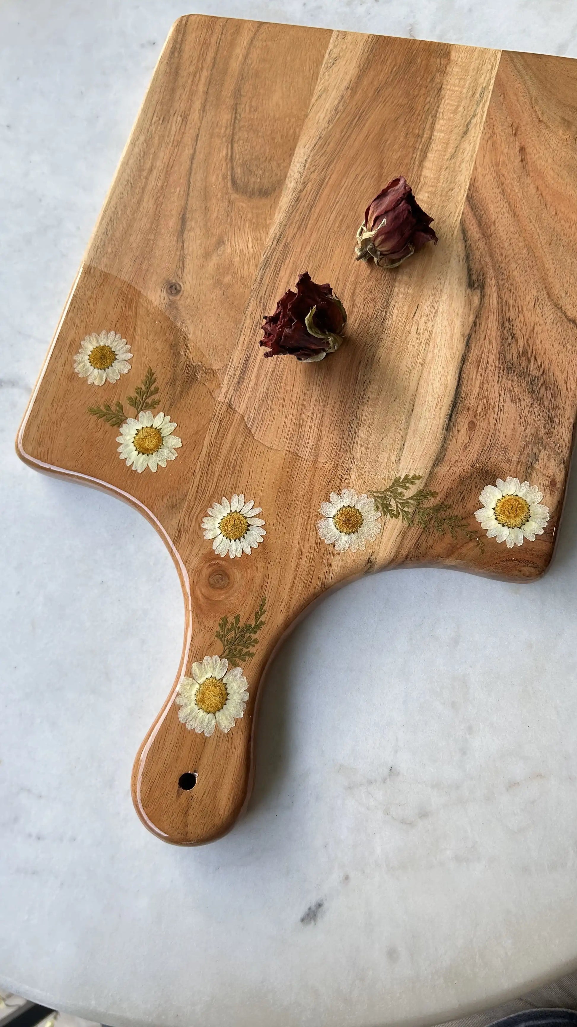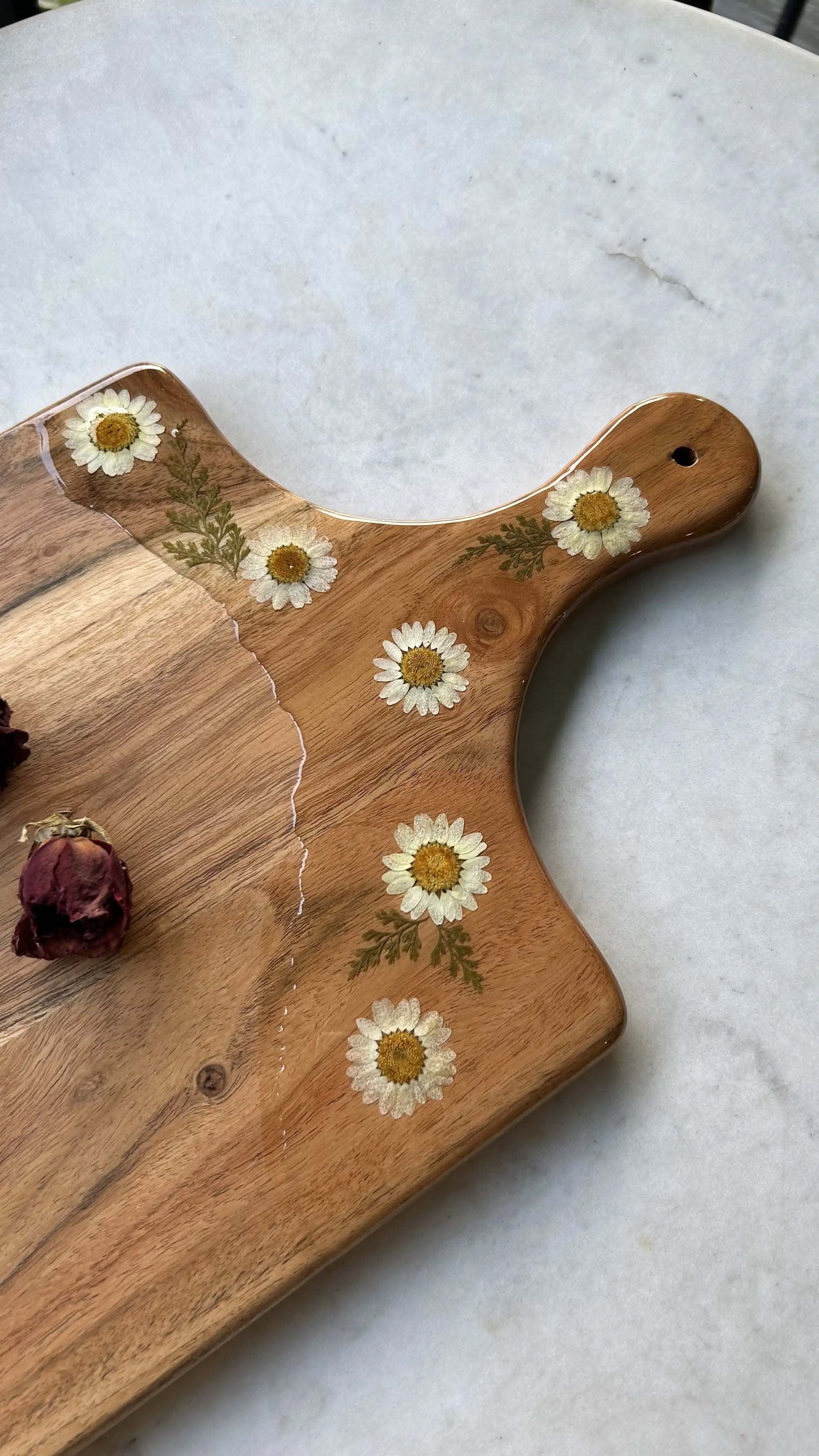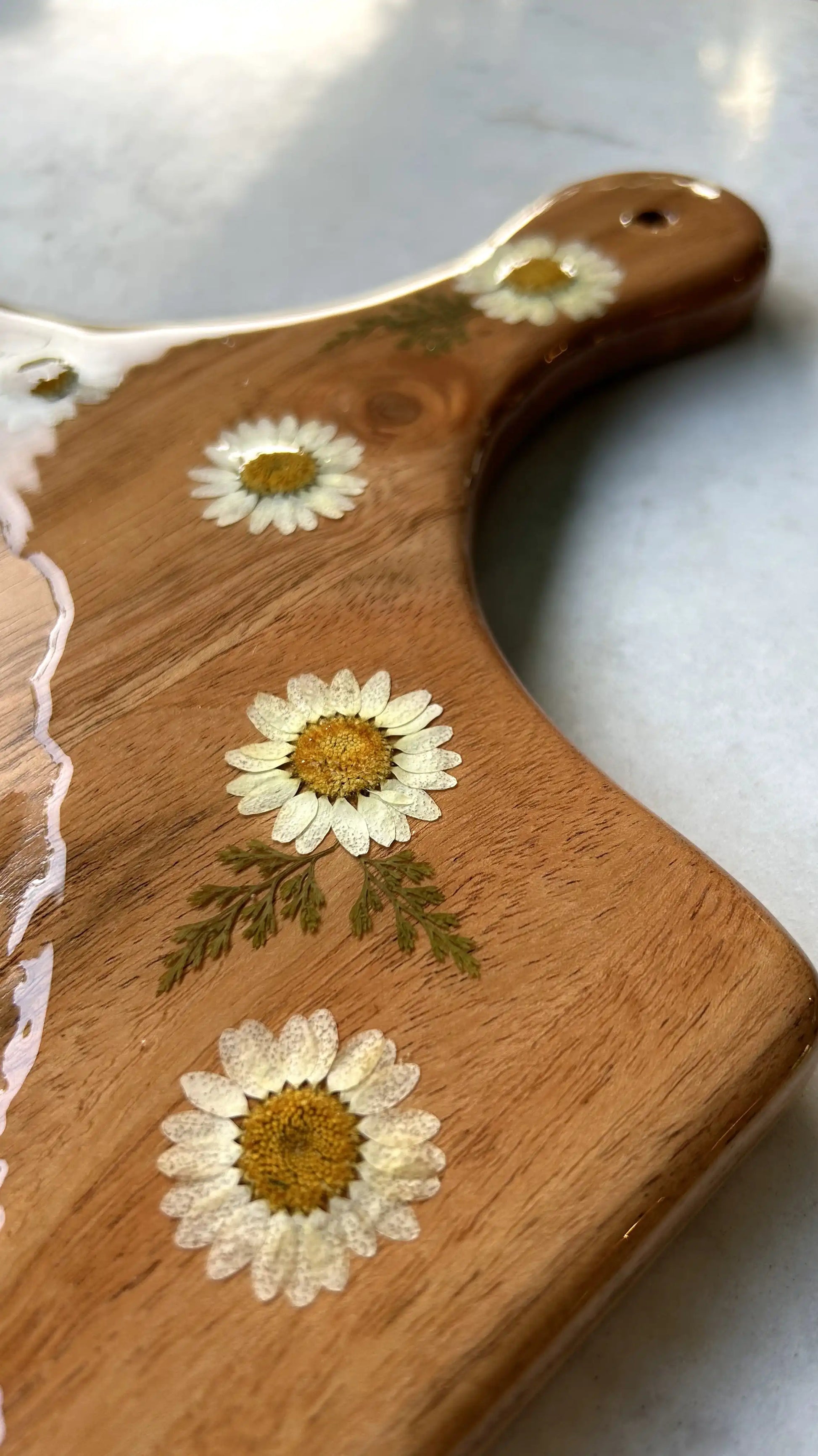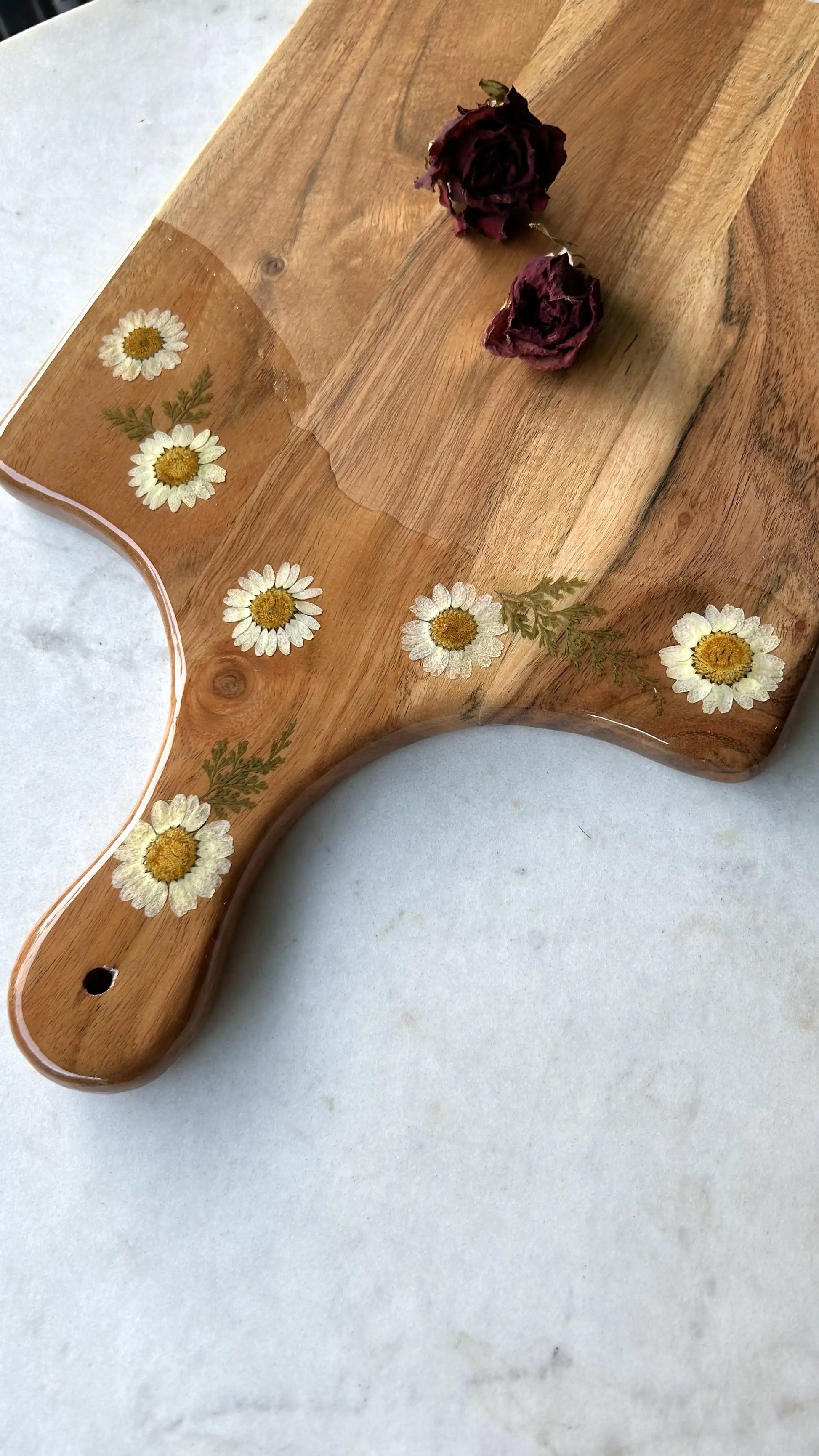Bring a touch of nature into your kitchen with this handcrafted wooden chopping board, featuring a resin-decorated handle embedded with delicate white daisies. The combination of natural wood and floral accents creates a charming and functional piece that’s perfect for everyday use.