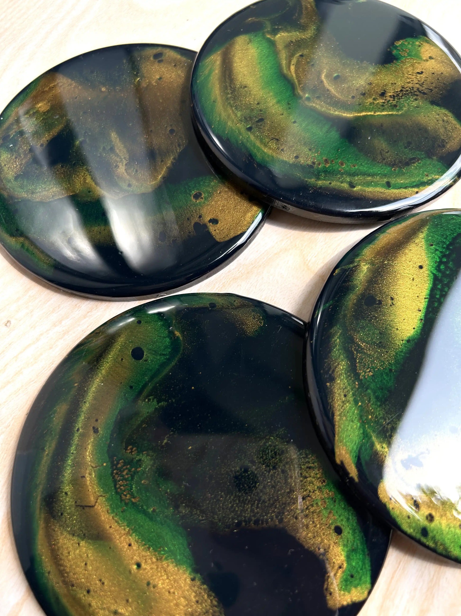 Elevate your décor with this exquisite coaster set, featuring organic cell-like patterns in green, black, and gold, crafted on an MDF base. Perfect for adding a touch of elegance and artistry to your home, these coasters are both decorative and practical. This coaster set is perfect for enhancing your coffee table or as a thoughtful gift for those who appreciate unique, handcrafted home décor.