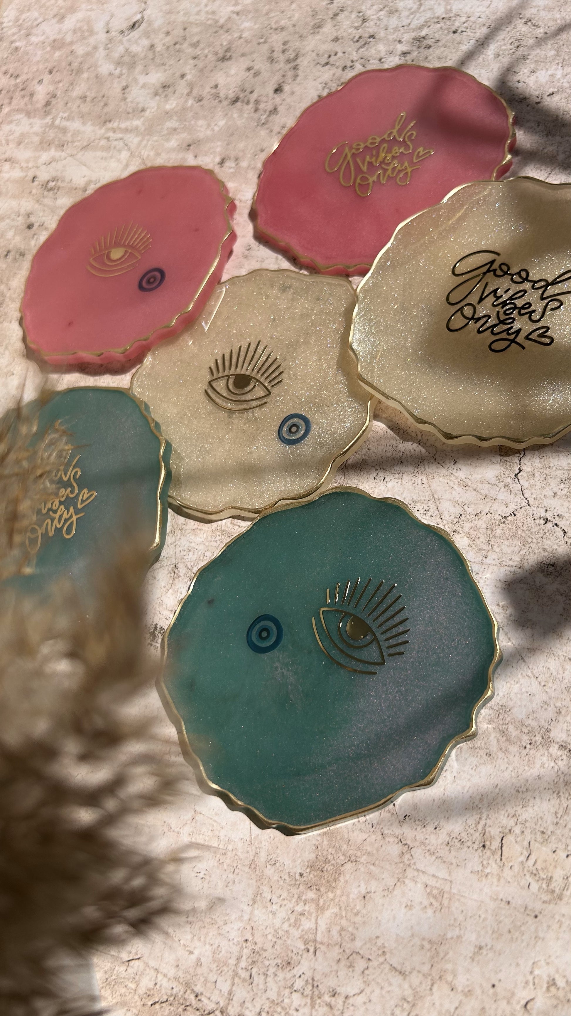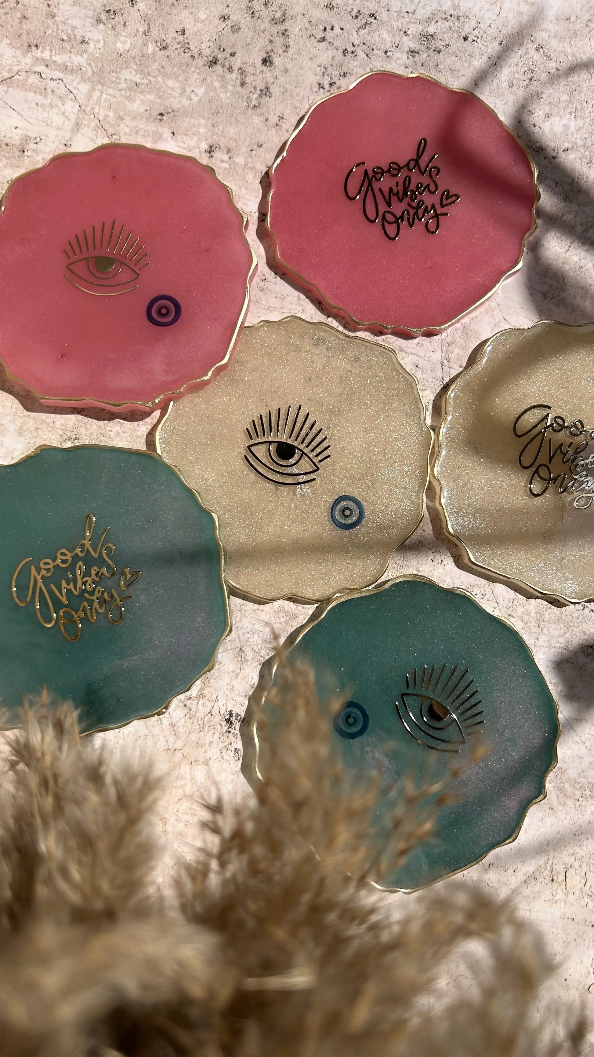 - Design: Each coaster showcases a unique color combination, enhanced with intricate evil eye stickers that bring a sense of protection and positive energy