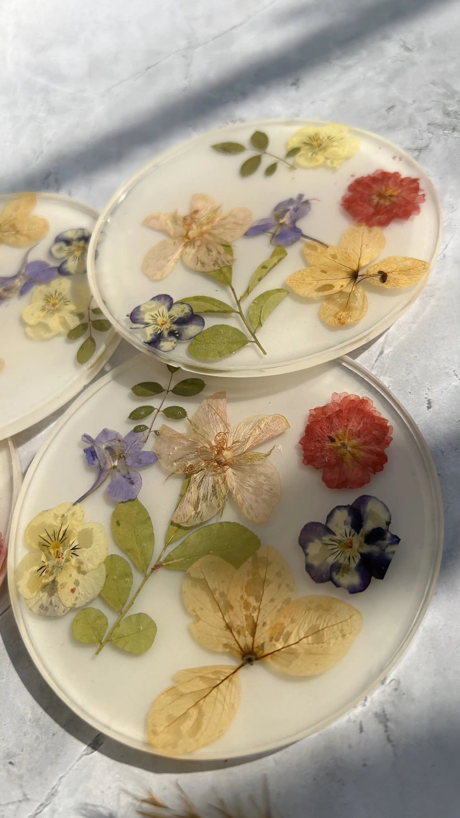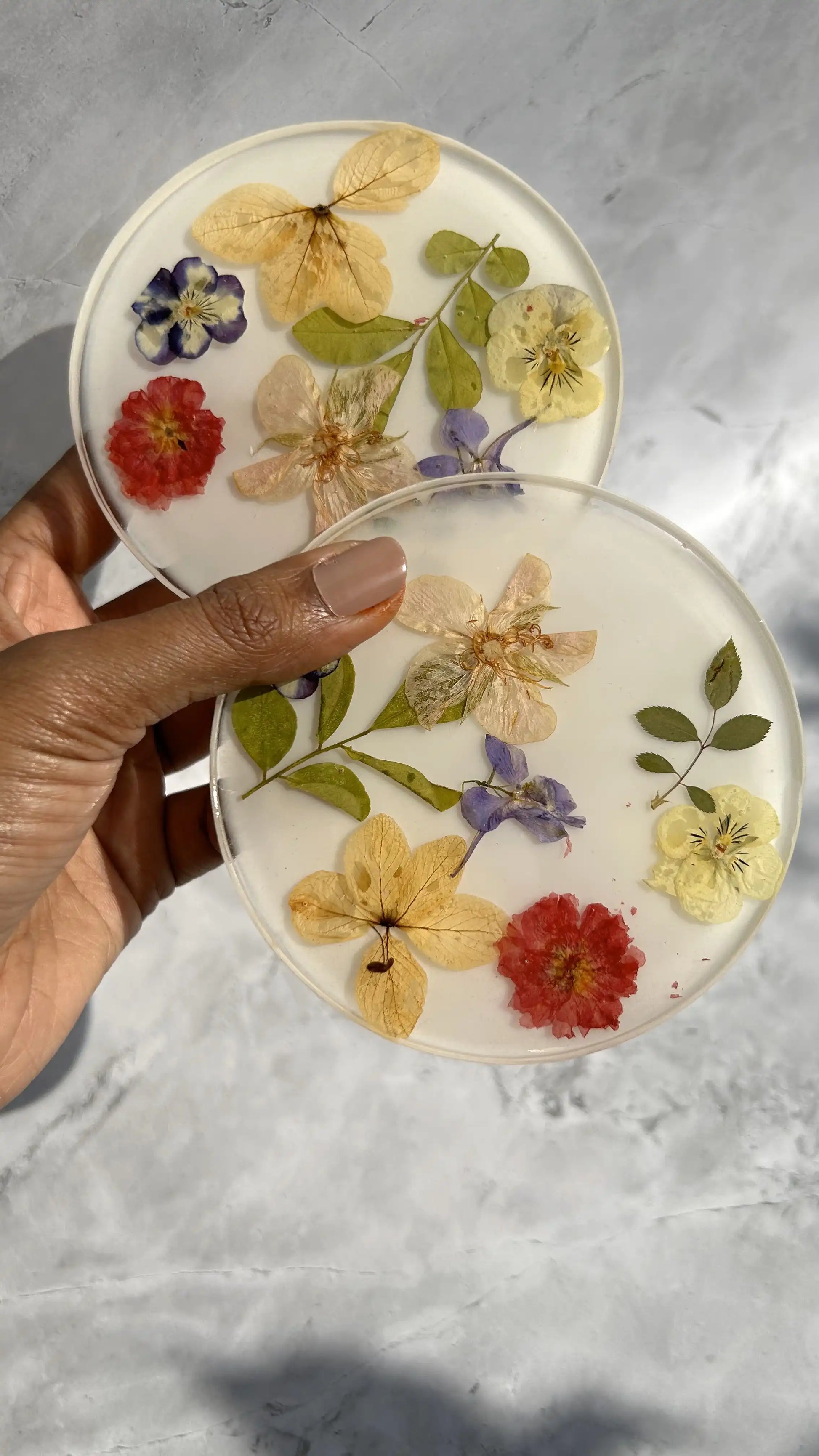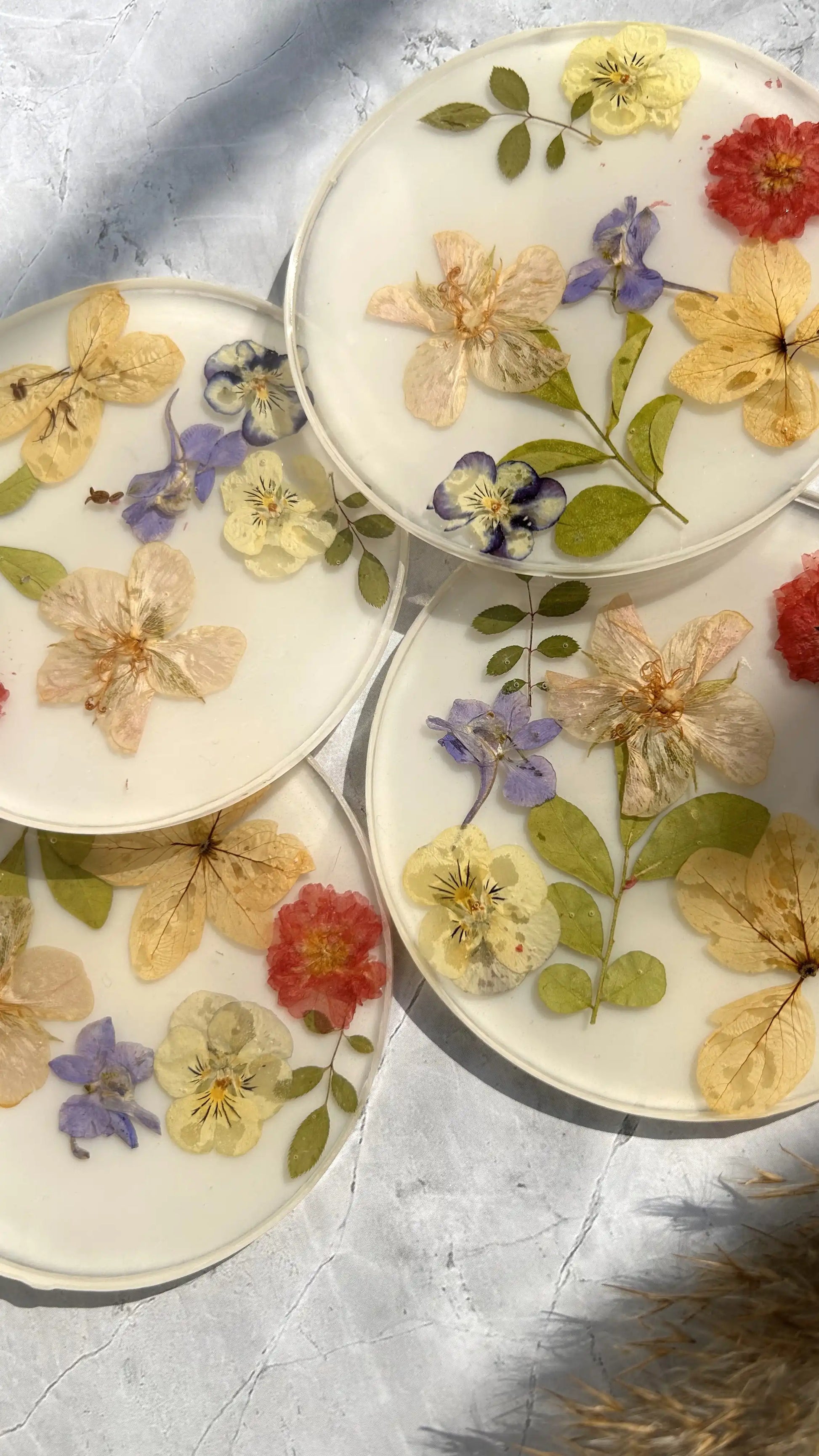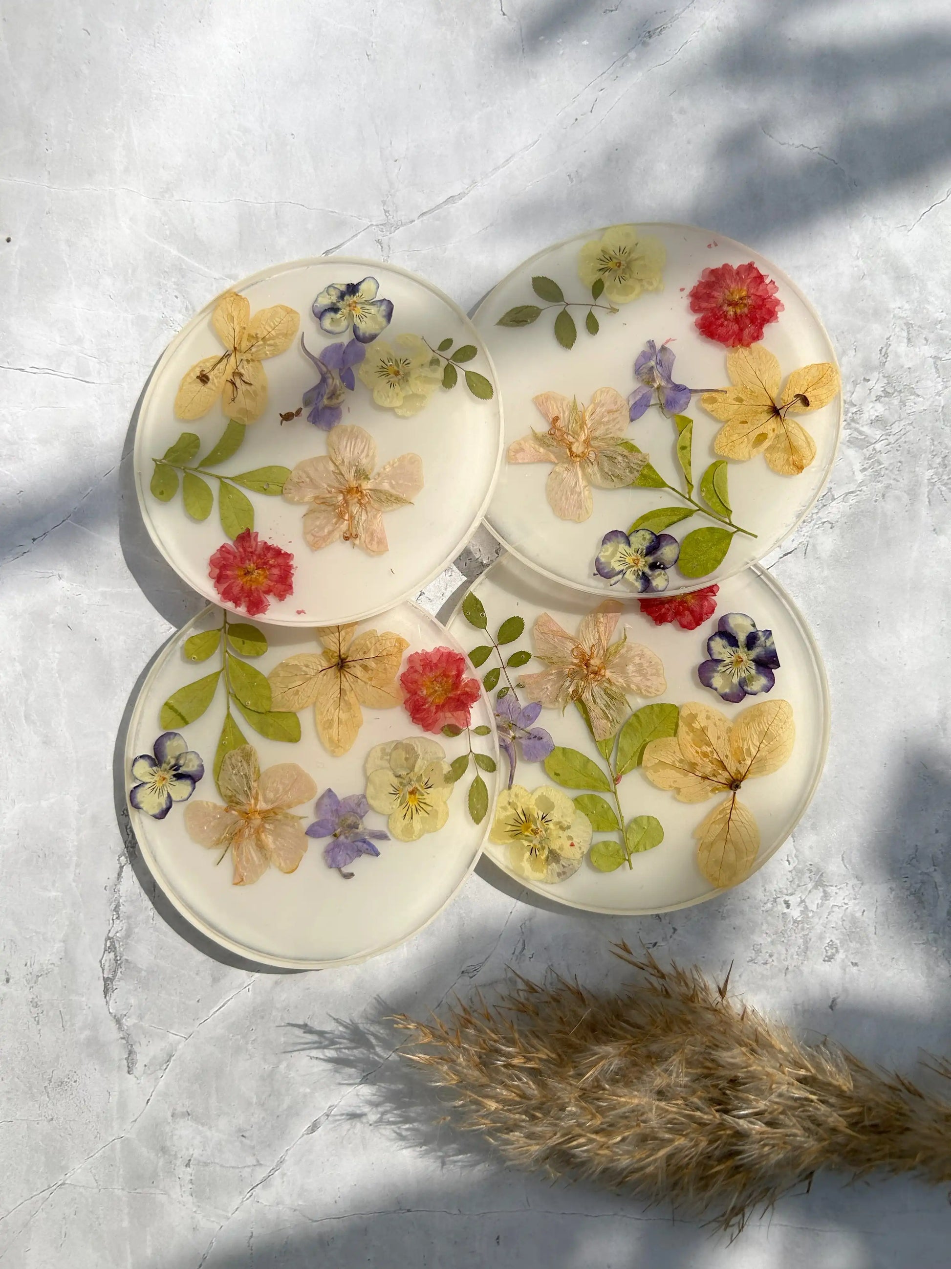 - Unique Designs: No two coasters are alike, each featuring a blend of dried flowers such as daisies, roses, lavender, and wildflowers.