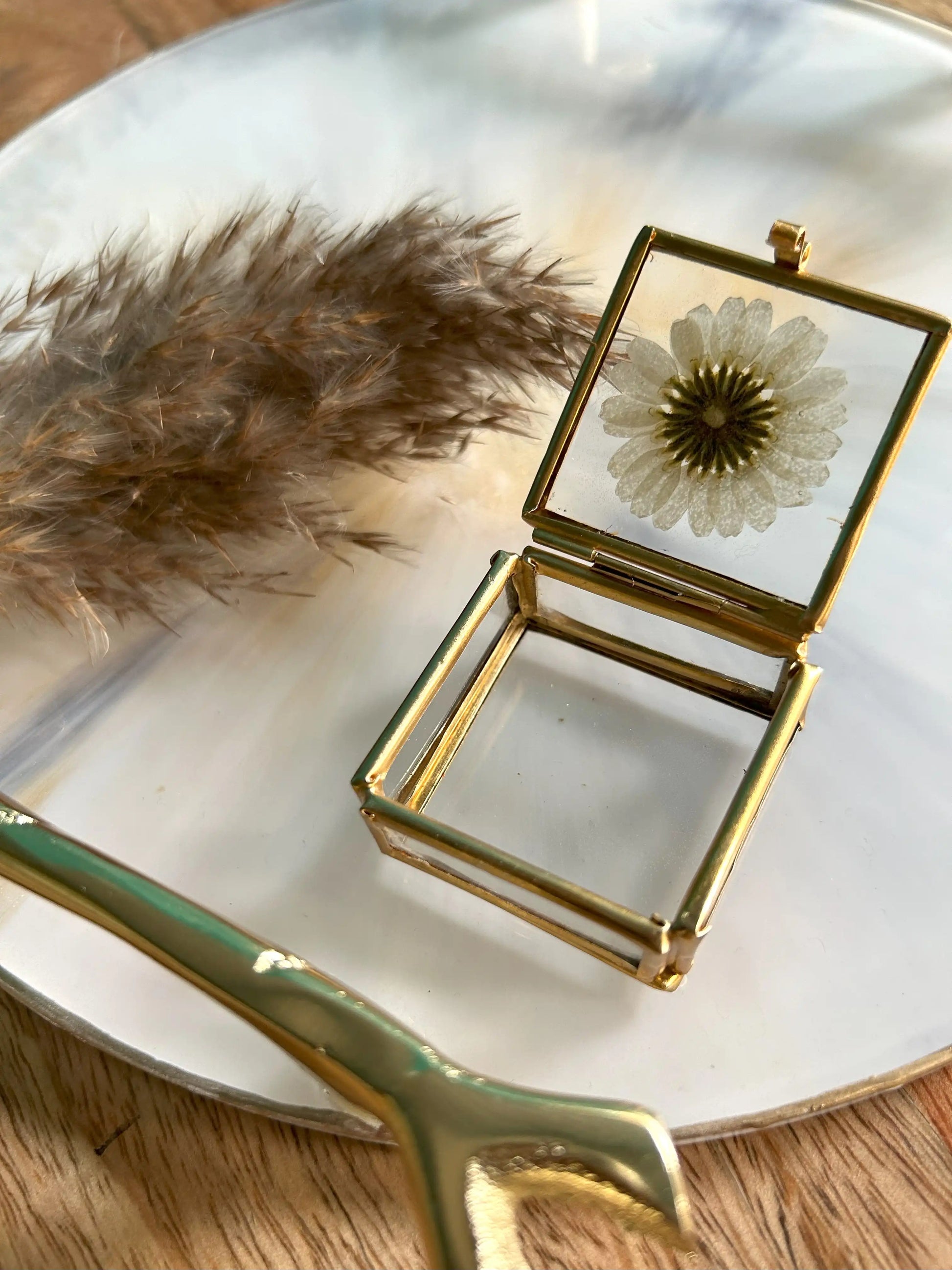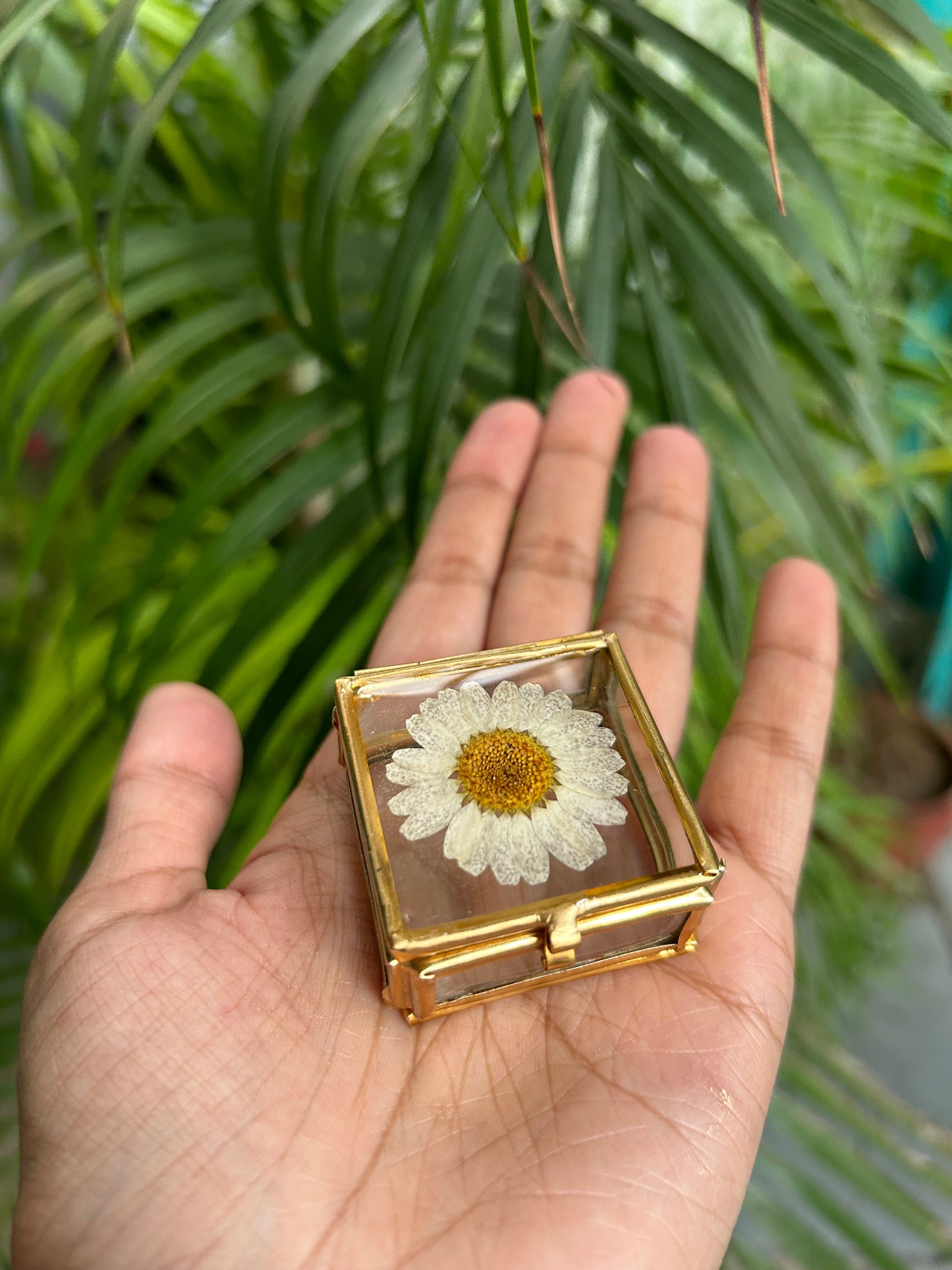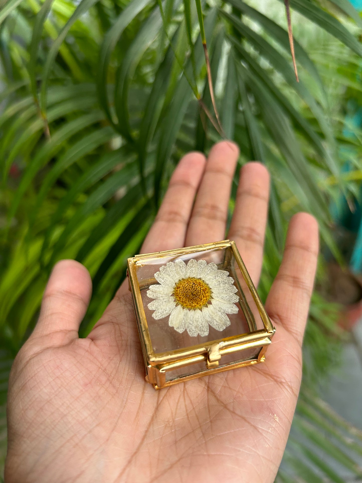 Introduce a touch of charm to your space with this adorable small glass metal box adorned with a delicate white daisy flower on top. Perfect for storing small treasures, jewelry, or keepsakes, this box combines functionality with a delightful aesthetic.