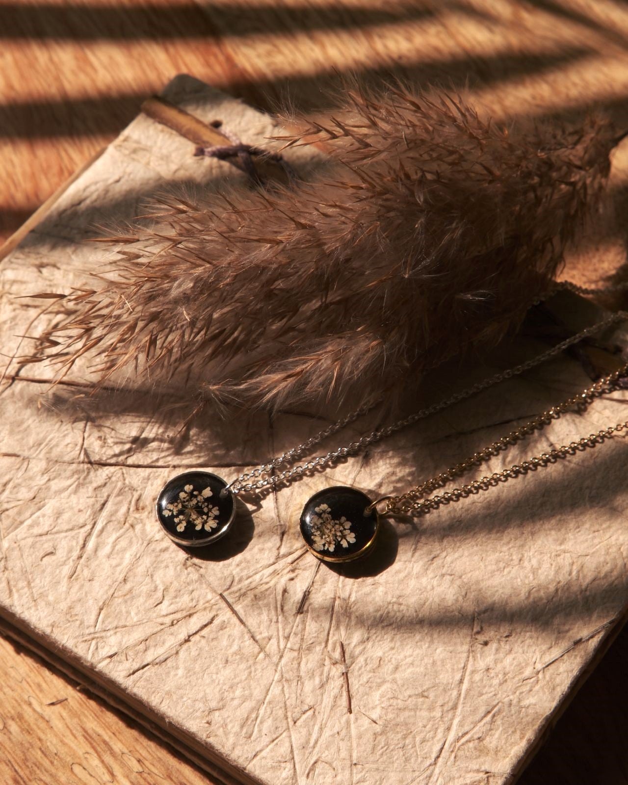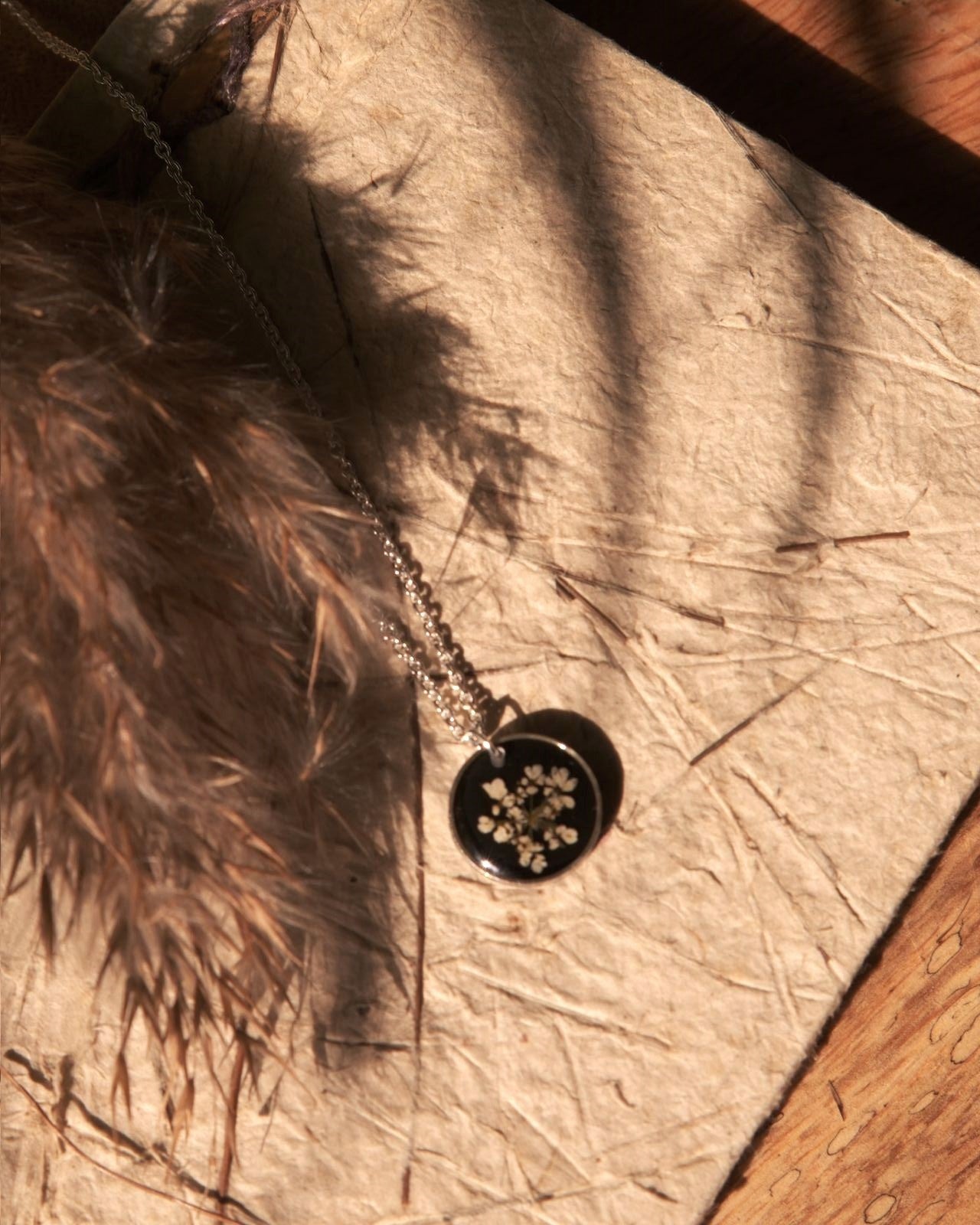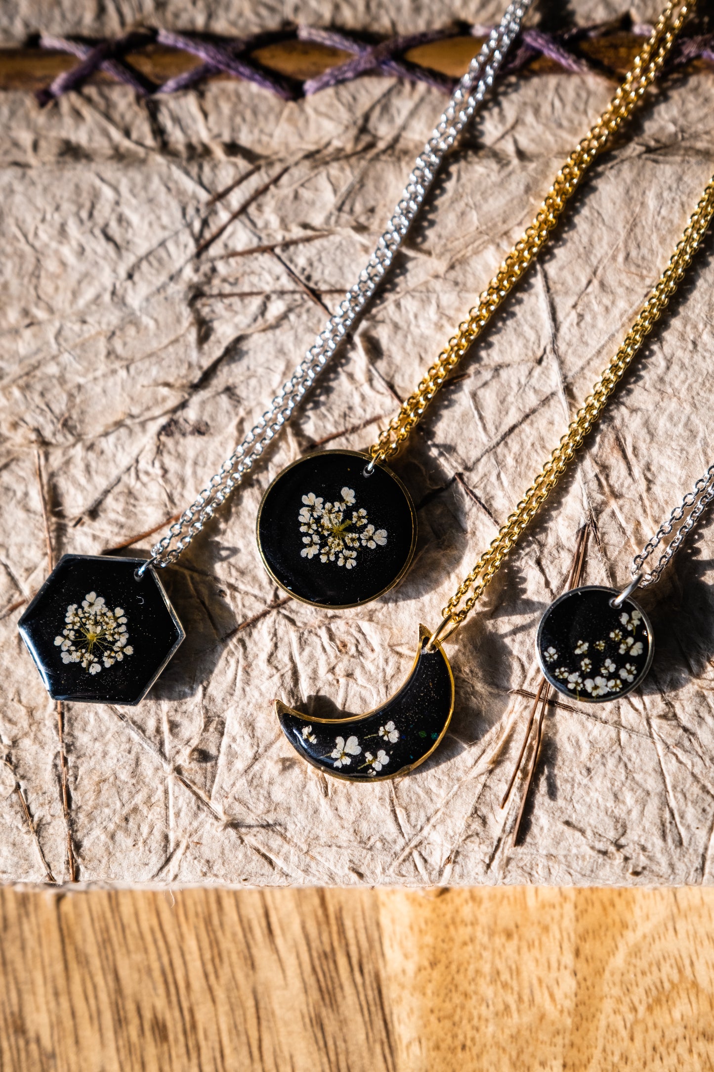 This unique piece beautifully captures the delicate elegance of the Hedge Parsley flower, showcasing its intricate details against a bold black background. Available in both lustrous silver and warm gold finishes, this necklace offers a versatile touch to any jewelry collection. The contrast of the vibrant flower against the dark base creates a stunning visual that draws the eye and sparks conversation.