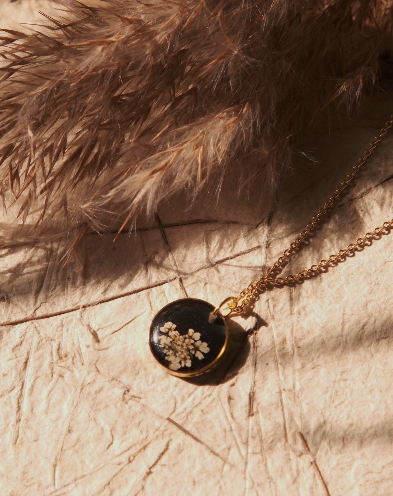 Introducing our enchanting Necklace featuring a tiny Hedge Parsley flower set against a striking black base.
