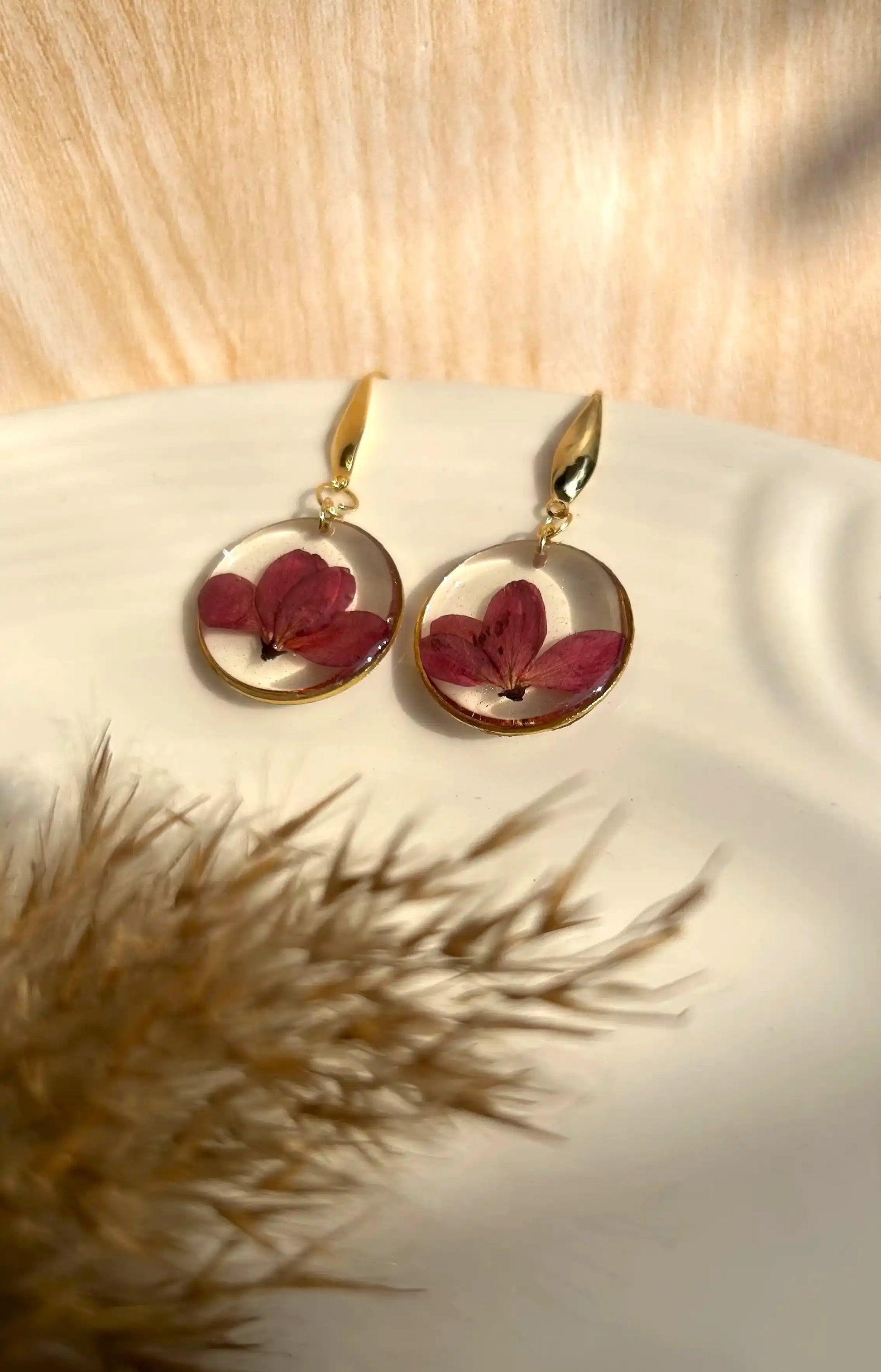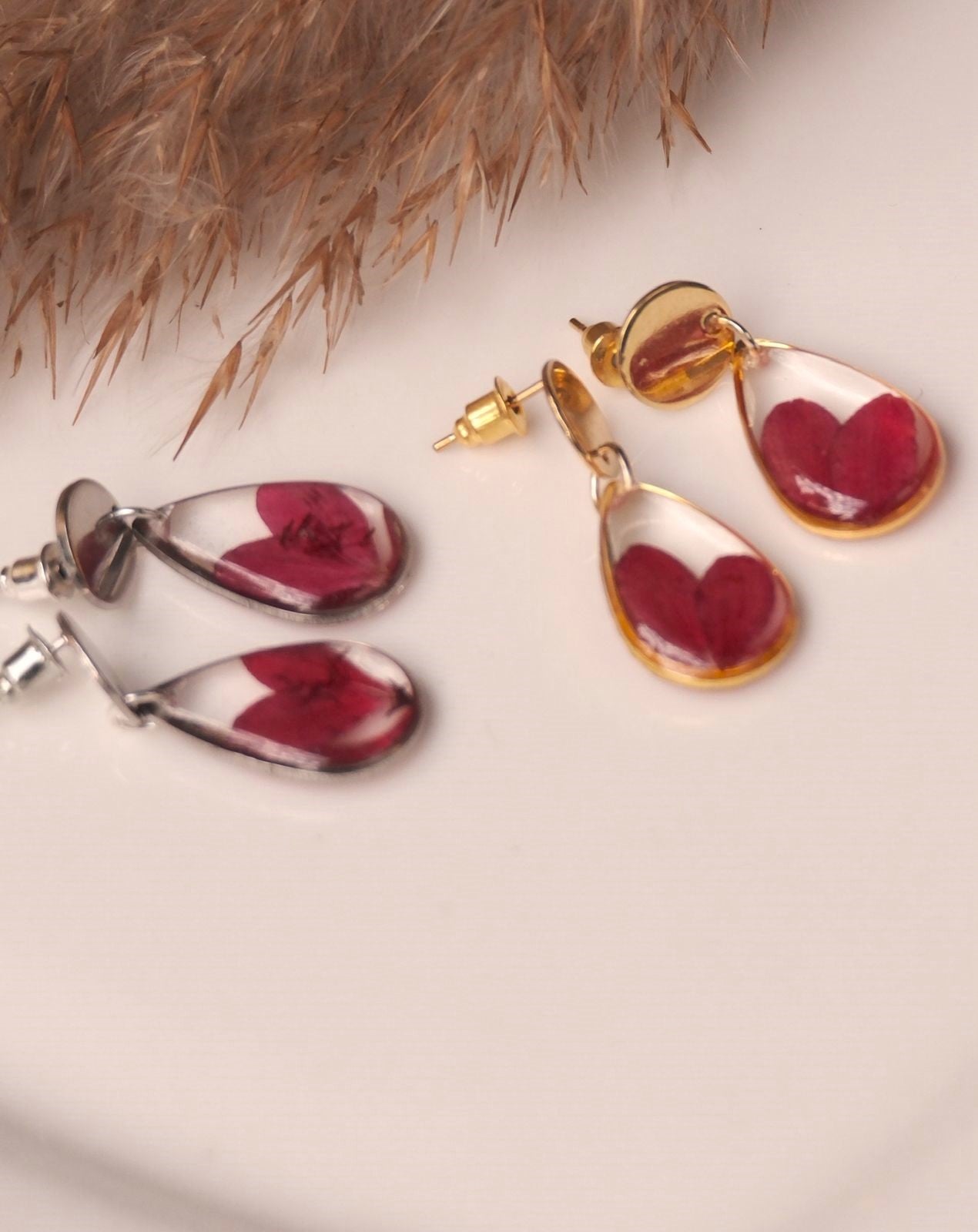 Elevate your accessory game with our stunning Golden Earrings, crafted from real red Jatropha flowers. Available in both heart shapes, these earrings capture the essence of nature’s beauty while adding a touch of elegance to any outfit. The vibrant red petals are beautifully preserved and encased in a luxurious gold finish, creating a striking contrast that’s perfect for both everyday wear and special occasions.