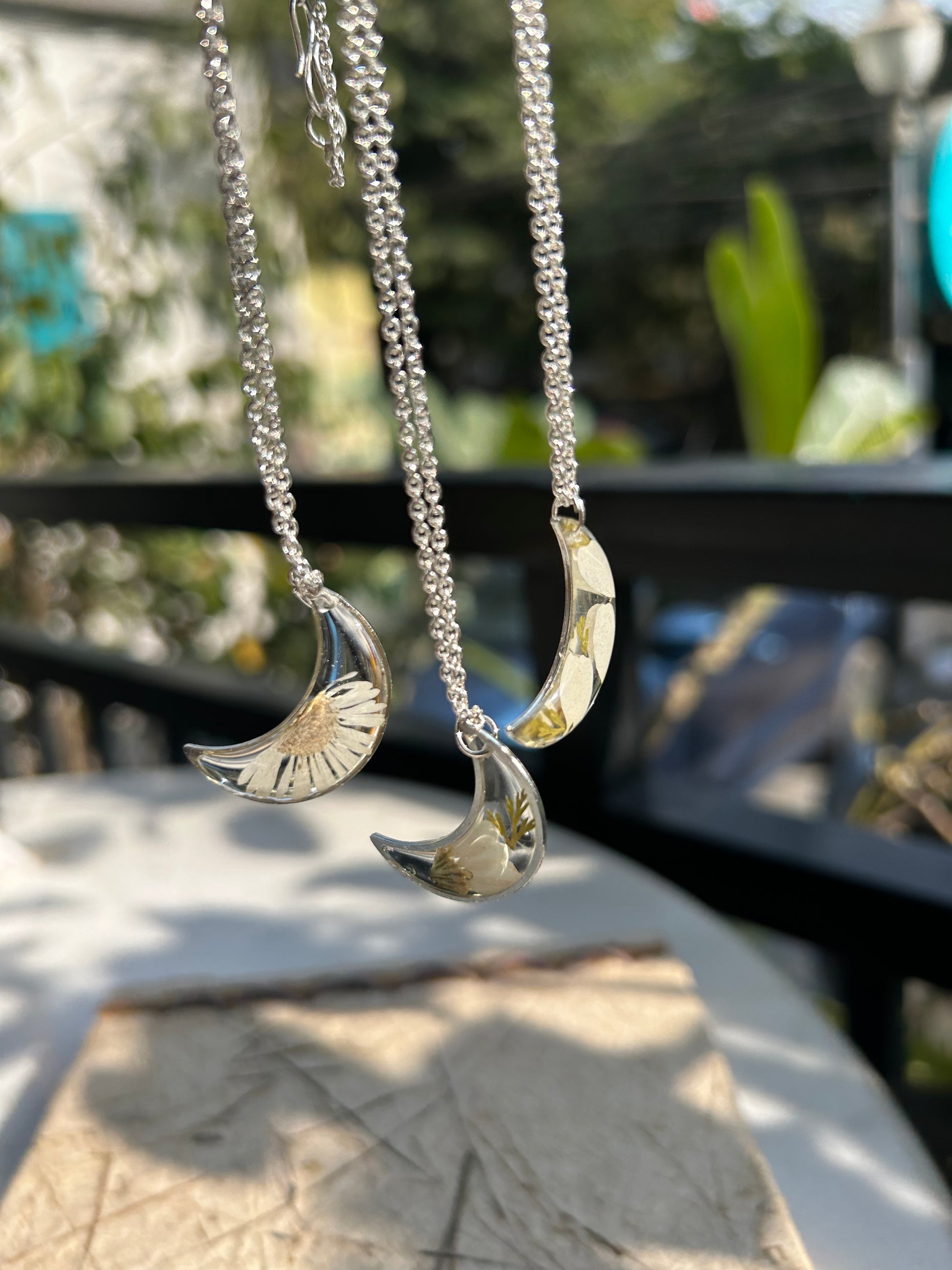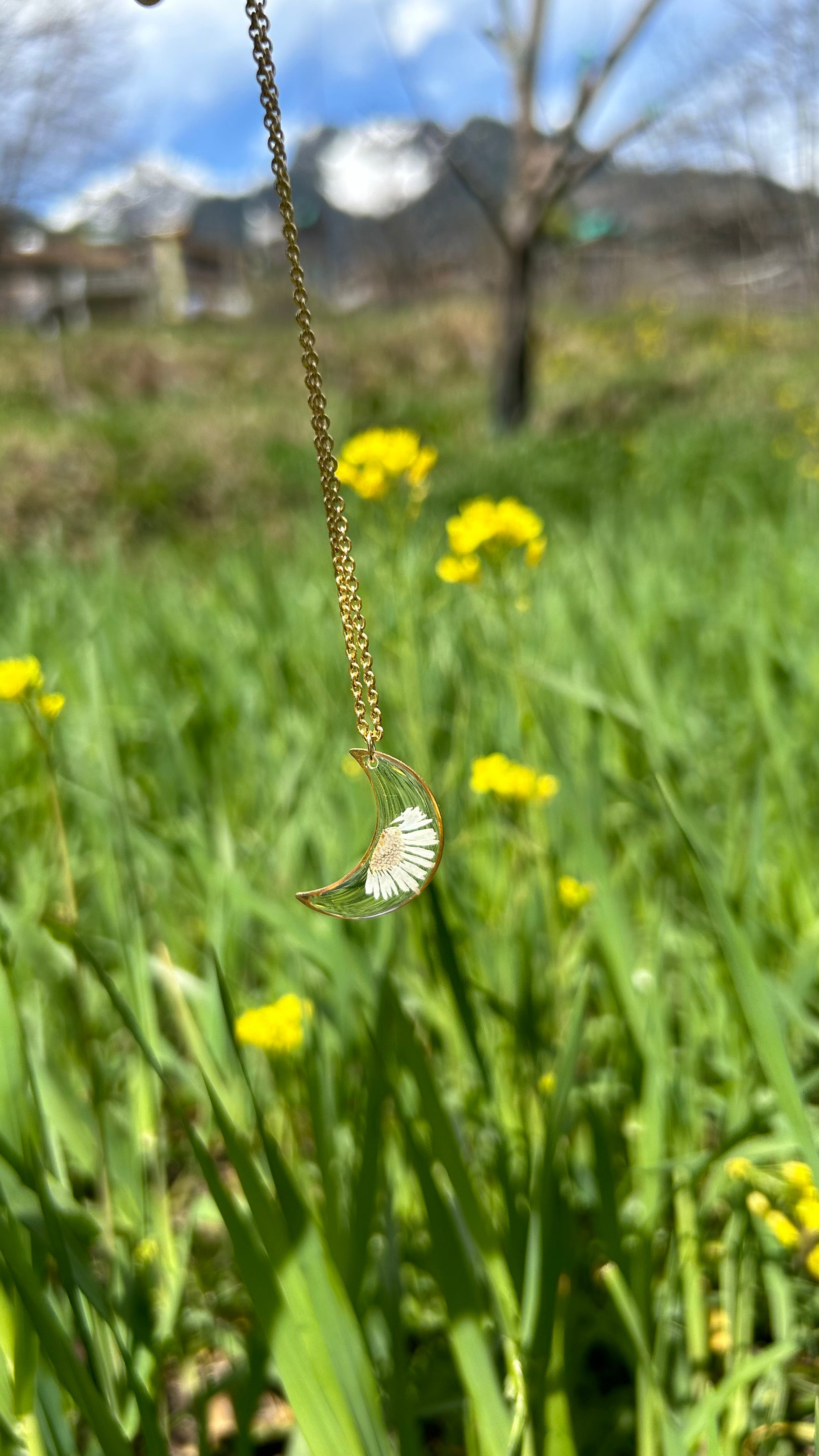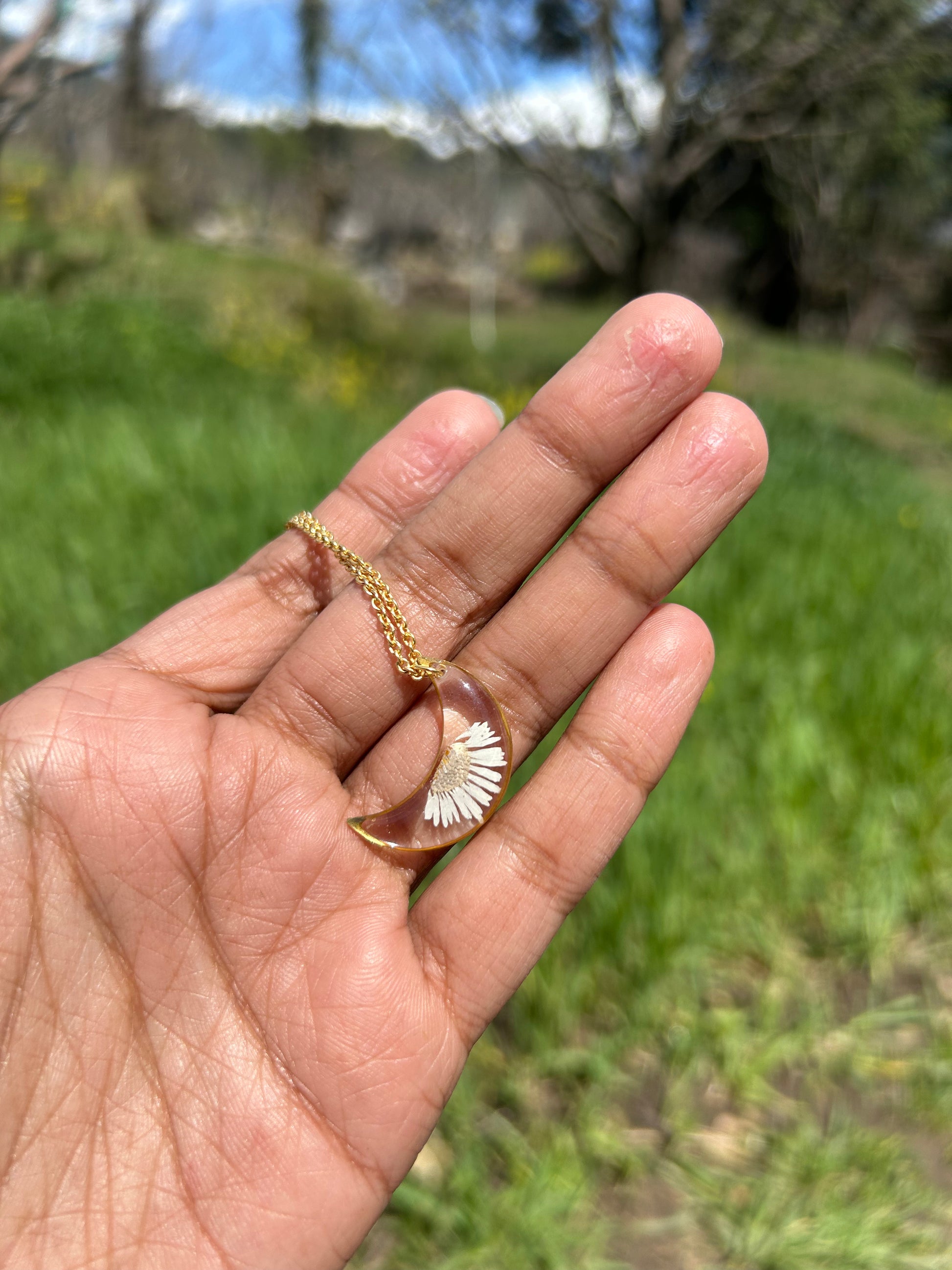 Illuminate your style with our Moon Necklace, featuring a beautifully preserved Bellis perennis flower. This enchanting piece captures the delicate charm of the common daisy, also known as Bellis perennis, symbolizing purity and new beginnings. Encased in clear resin, the flower is artfully arranged in a crescent moon design, creating a stunning focal point that celebrates the beauty of nature. The necklace is designed to be both elegant and versatile, perfect for adding a touch of whimsy to your everyday look or as a standout accessory for special occasions. Its adjustable chain ensures a comfortable fit, making it easy to layer with other pieces or wear alone as a statement piece.