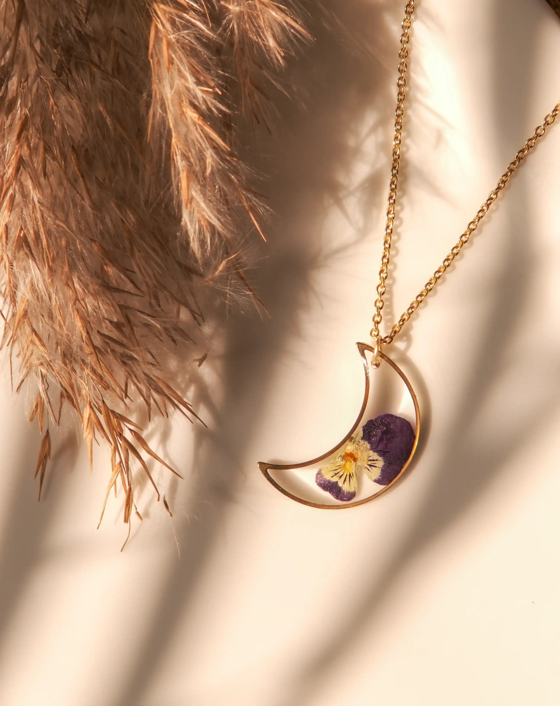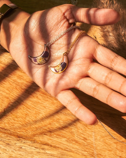 This unique piece captures the elegance of nature and the mystique of the moon. The crescent moon design symbolizes growth and transformation, while the vibrant purple Pensi flower adds a touch of serenity and grace. Encased in a clear, glossy resin, each flower is preserved in its natural beauty, making every necklace a one-of-a-kind piece.