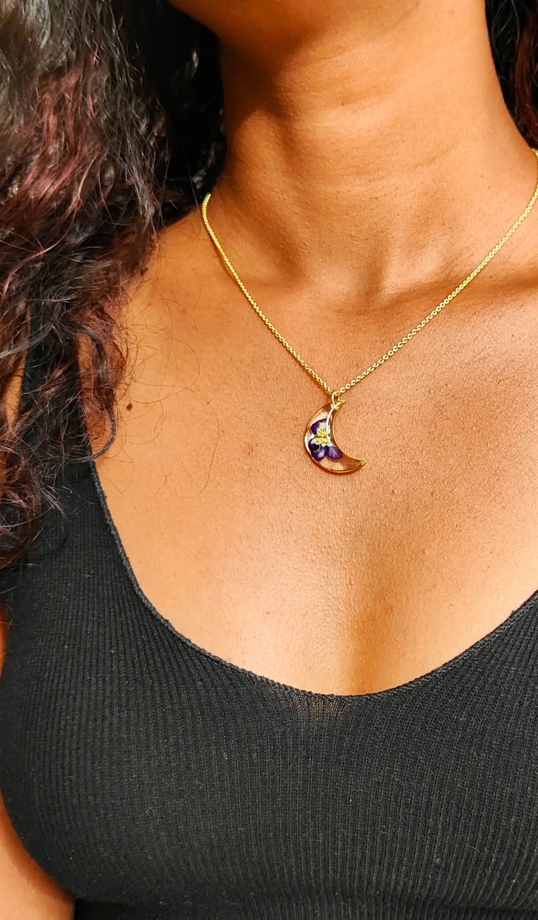Elevate your style with the enchanting beauty of our Moon-Shaped Necklace, delicately crafted with real purple Pensi flowers.